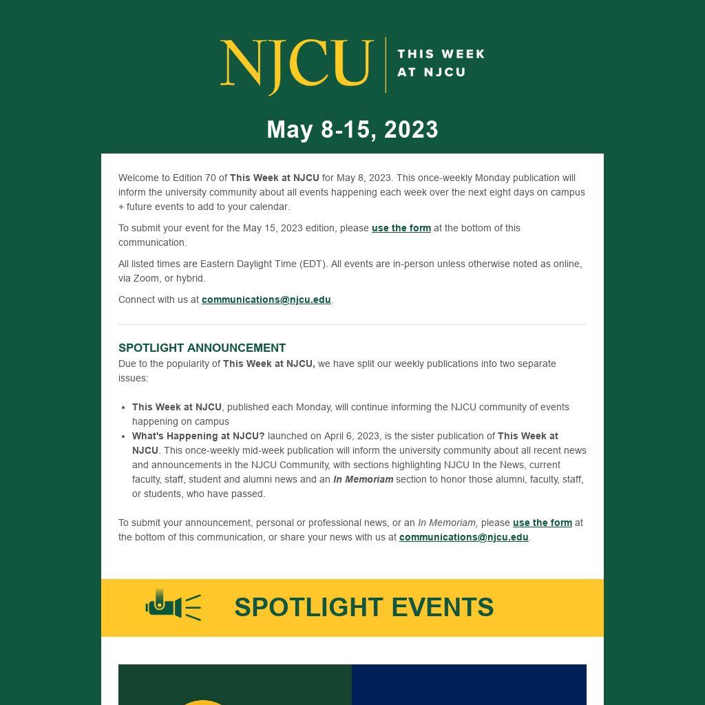 - This Week at NJCU, published each Monday, will continue informing the NJCU community of events happening on campus