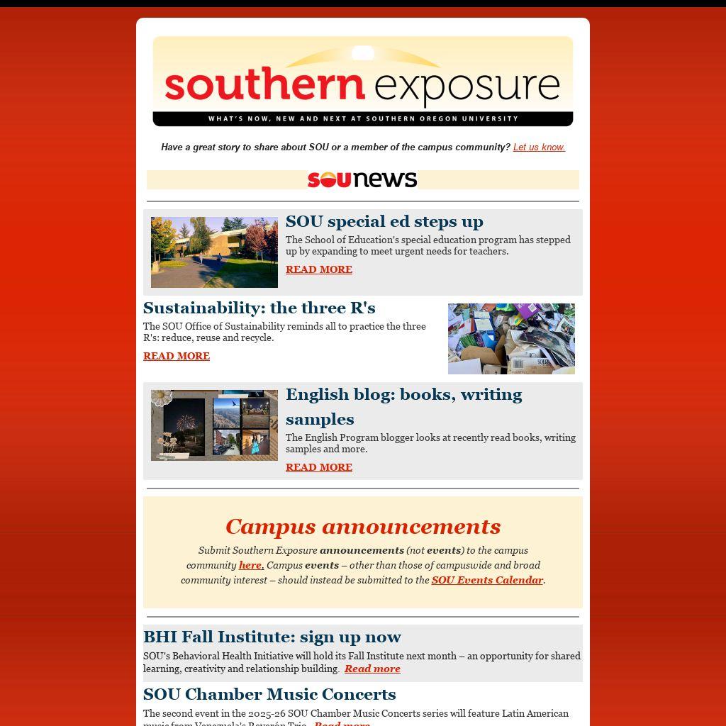 Submit Southern Exposure announcements (not events) to the campus community here. Campus events – other than those of campuswide and broad community interest – should instead be submitted to the SOU Events Calendar.