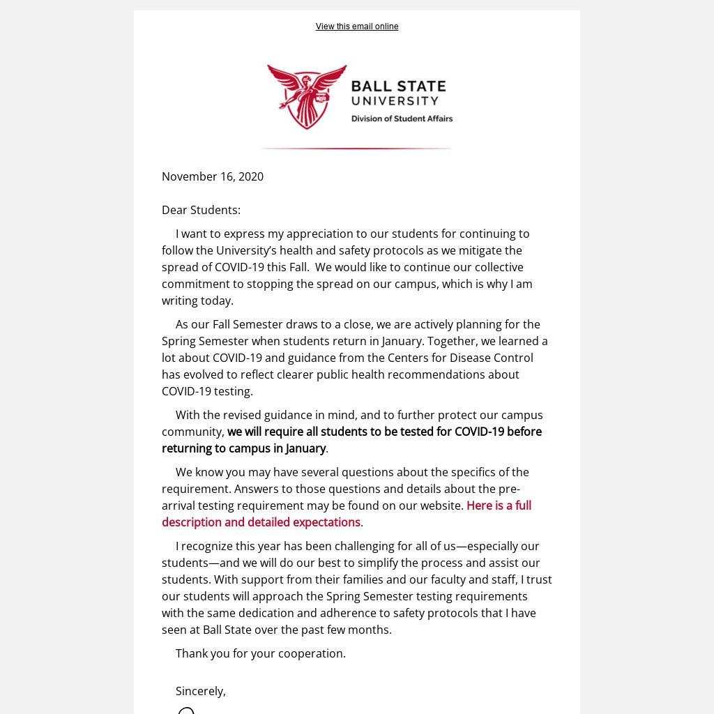 I recognize this year has been challenging for all of us—especially our students—and we will do our best to simplify the process and assist our students. With support from their families and our faculty and staff, I trust our students will approach the Spring Semester testing requirements with the same dedication and adherence to safety protocols that I have seen at Ball State over the past few months.