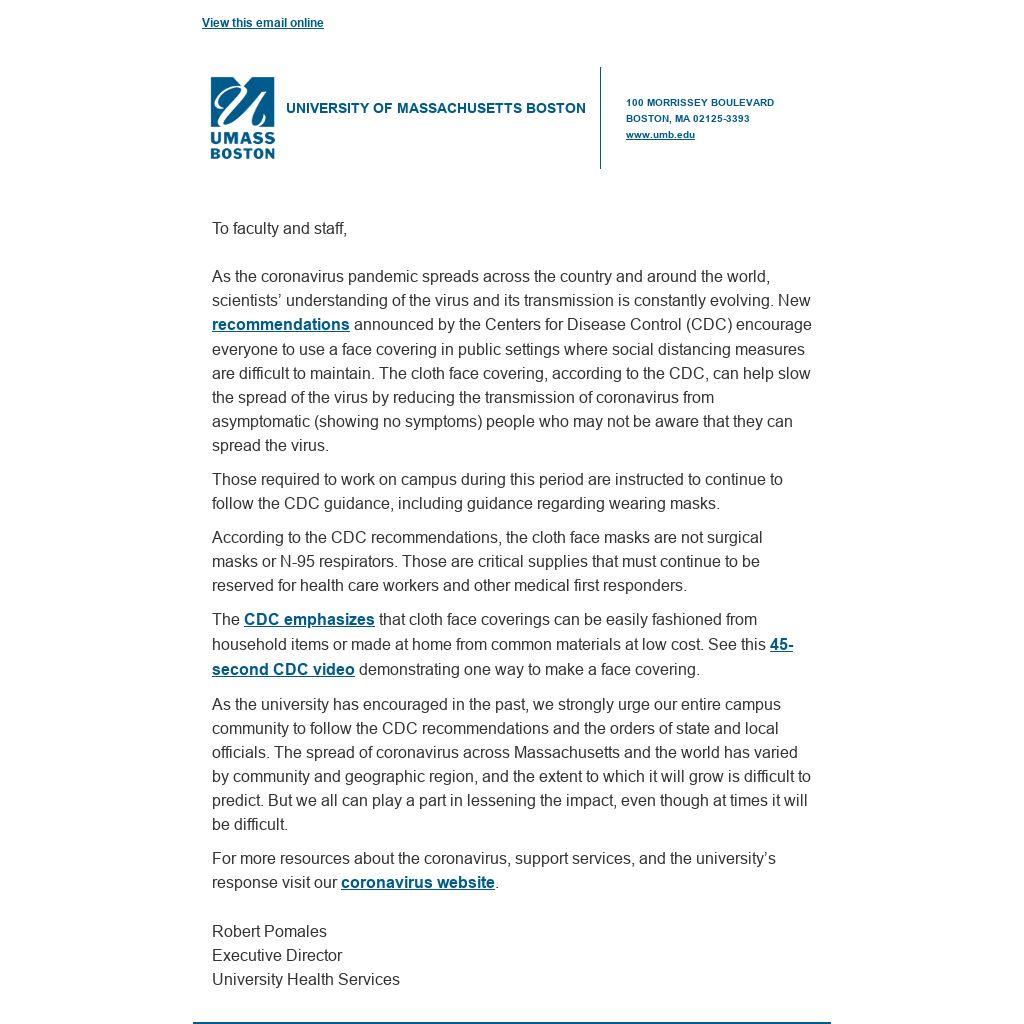 As the university has encouraged in the past, we strongly urge our entire campus community to follow the CDC recommendations and the orders of state and local officials. The spread of coronavirus across Massachusetts and the world has varied by community and geographic region, and the extent to which it will grow is difficult to predict. But we all can play a part in lessening the impact, even though at times it will be difficult.