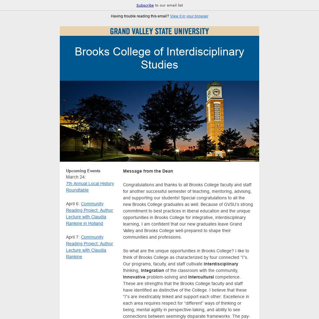 Congratulations and thanks to all Brooks College faculty and staff for another successful semester of teaching, mentoring, advising, and supporting our students! Special congratulations to all the new Brooks College graduates as well. Because of GVSU’s strong commitment to best practices in liberal education and the unique opportunities in Brooks College for integrative, interdisciplinary learning, I am confident that our new graduates leave Grand Valley and Brooks College well-prepared to shape their communities and professions.