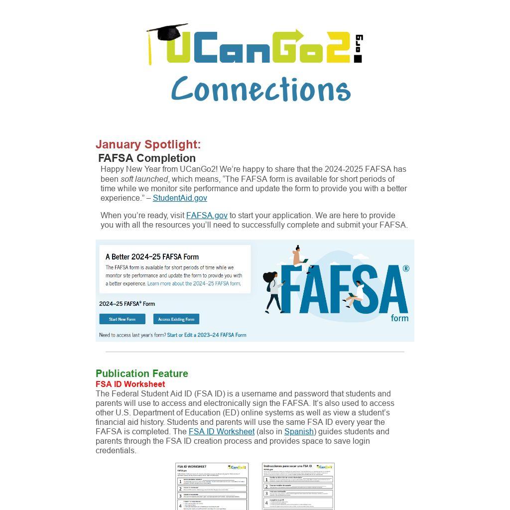 Happy New Year from UCanGo2! We’re happy to share that the 2024-2025 FAFSA has been soft launched, which means, “The FAFSA form is available for short periods of time while we monitor site performance and update the form to provide you with a better experience.” – StudentAid.gov
