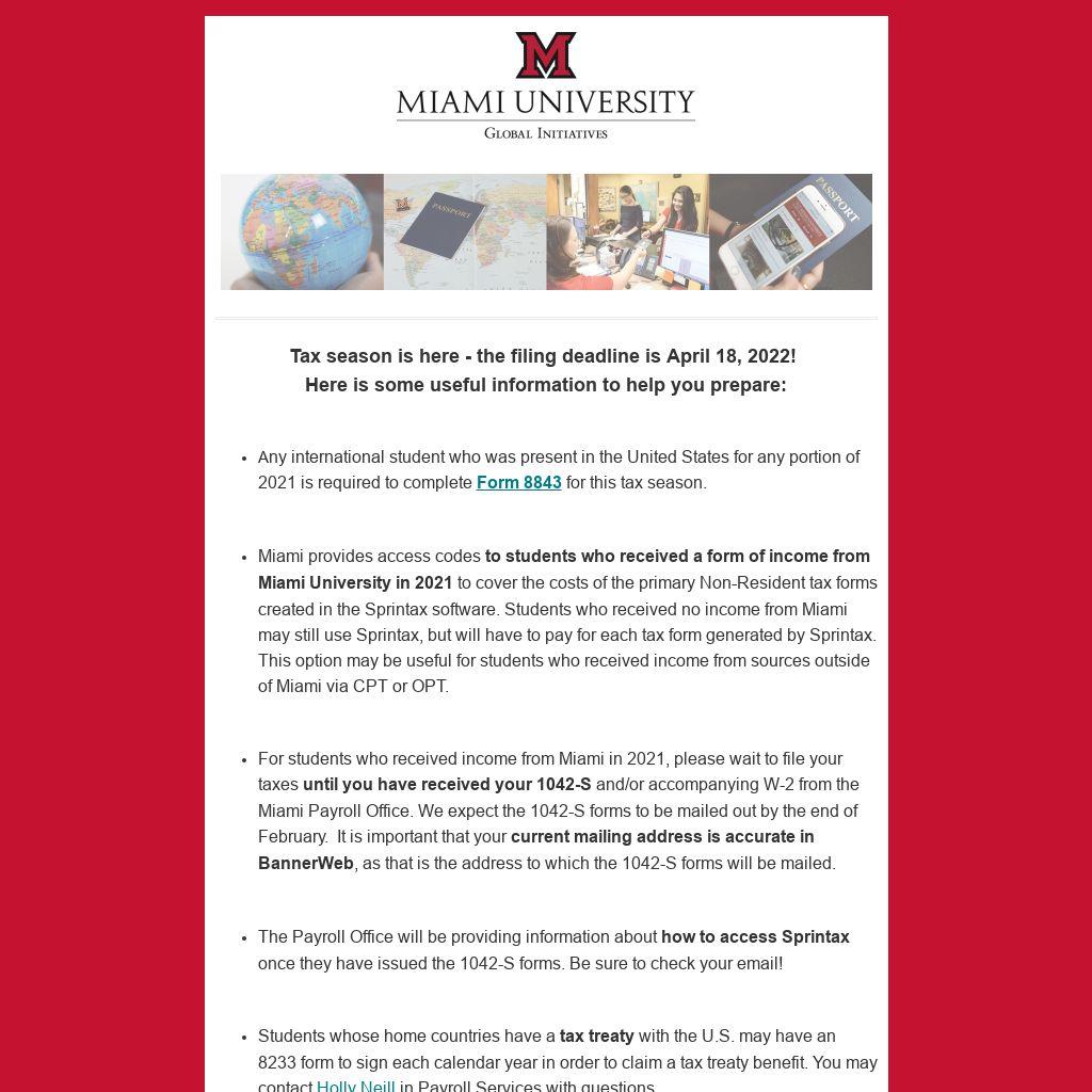 For students who received income from Miami in 2021, please wait to file your taxes until you have received your 1042-S and/or accompanying W-2 from the Miami Payroll Office. We expect the 1042-S forms to be mailed out by the end of February. It is important that your current mailing address is accurate in BannerWeb, as that is the address to which the 1042-S forms will be mailed.