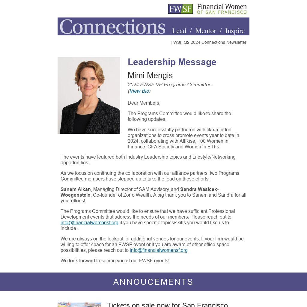 The Programs Committee would like to ensure that we have sufficient Professional Development events that address the needs of our members. Please reach out to info@financialwomensf.org if you have specific topics/skills you would like us to include.