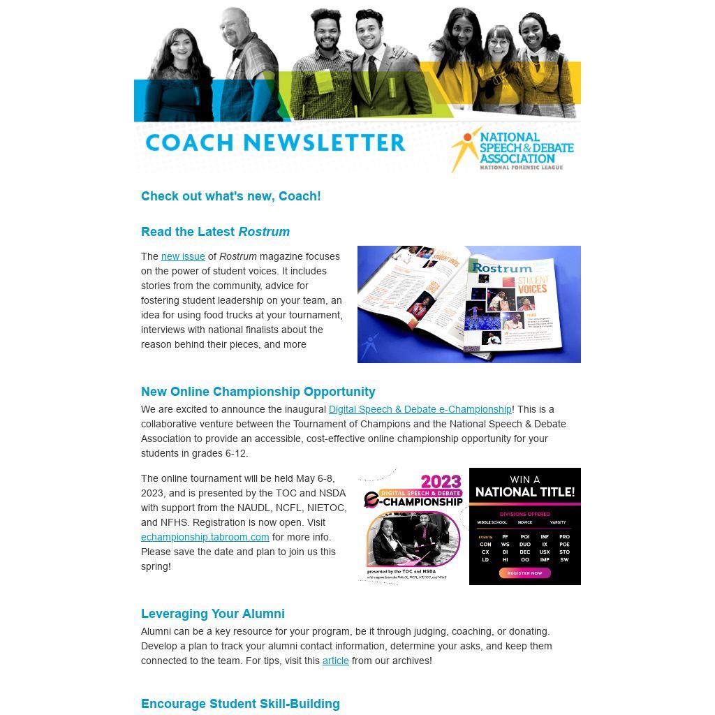 The new issue of Rostrum magazine focuses on the power of student voices. It includes stories from the community, advice for fostering student leadership on your team, an idea for using food trucks at your tournament, interviews with national finalists about the reason behind their pieces, and more