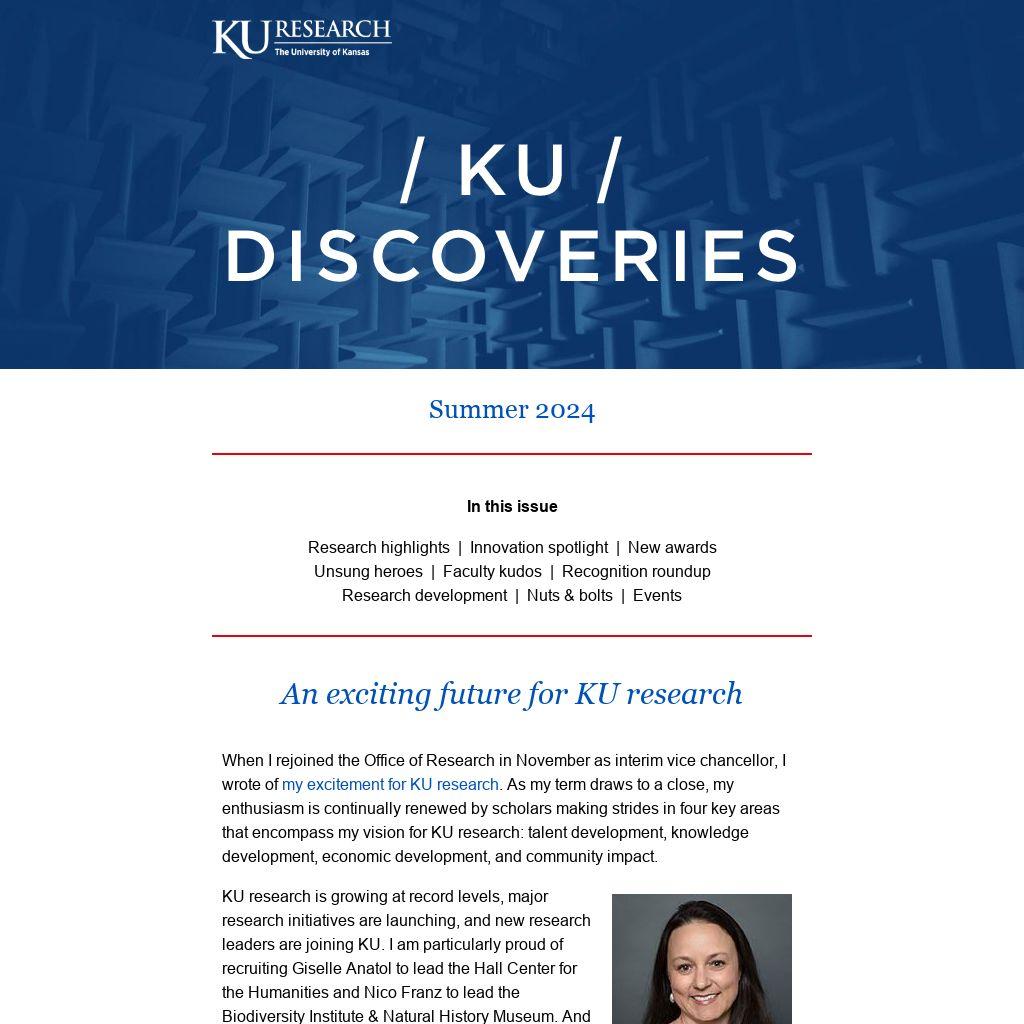 When I rejoined the Office of Research in November as interim vice chancellor, I wrote of my excitement for KU research. As my term draws to a close, my enthusiasm is continually renewed by scholars making strides in four key areas that encompass my vision for KU research: talent development, knowledge development, economic development, and community impact.