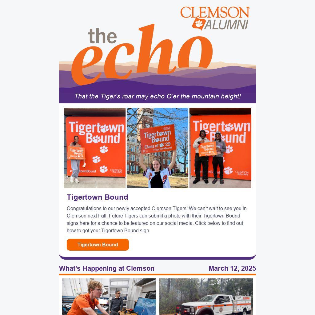 Congratulations to our newly accepted Clemson Tigers! We can't wait to see you in Clemson next Fall. Future Tigers can submit a photo with their Tigertown Bound signs here for a chance to be featured on our social media. Click below to find out how to get your Tigertown Bound sign.
