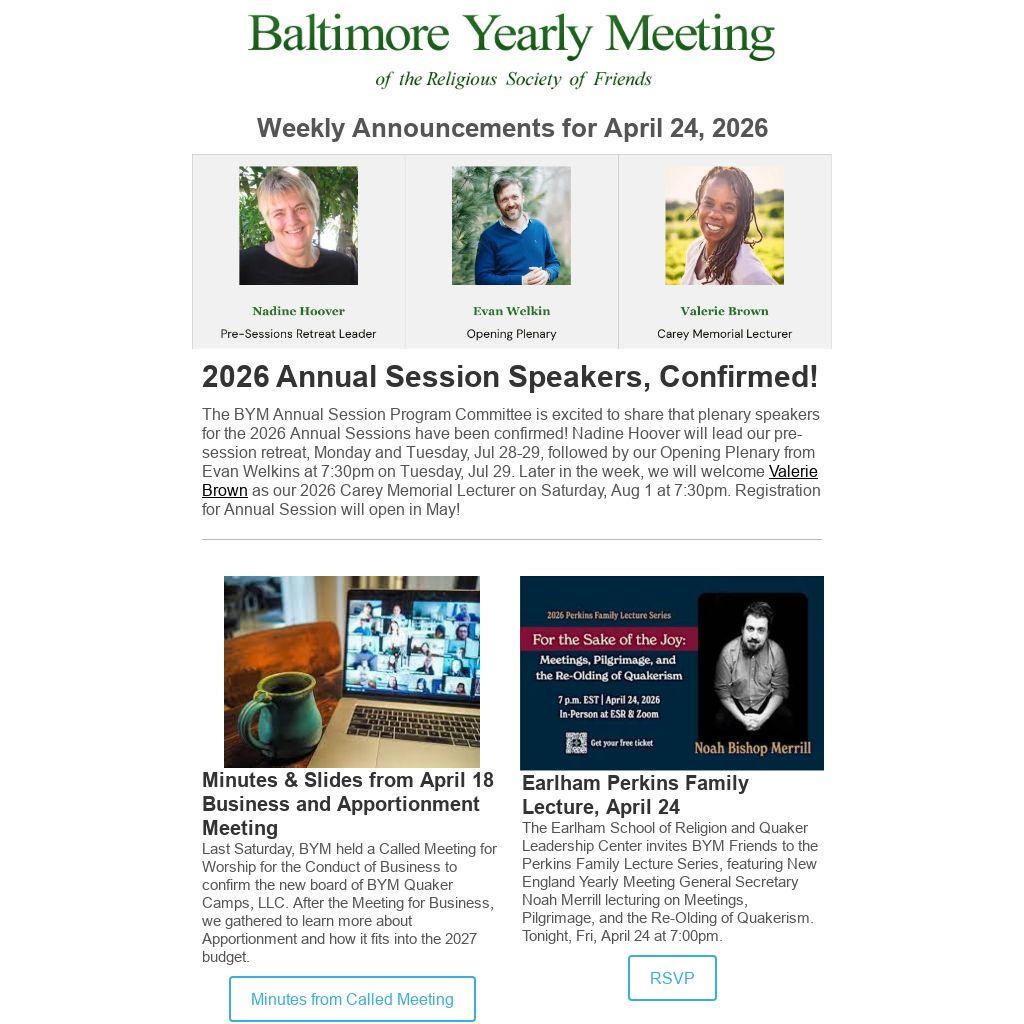 The BYM Annual Session Program Committee is excited to share that plenary speakers for the 2026 Annual Sessions have been confirmed! Nadine Hoover will lead our pre-session retreat, Monday and Tuesday, Jul 28-29, followed by our Opening Plenary from Evan Welkins at 7:30pm on Tuesday, Jul 29. Later in the week, we will welcome Valerie Brown as our 2026 Carey Memorial Lecturer on Saturday, Aug 1 at 7:30pm. Registration for Annual Session will open in May!