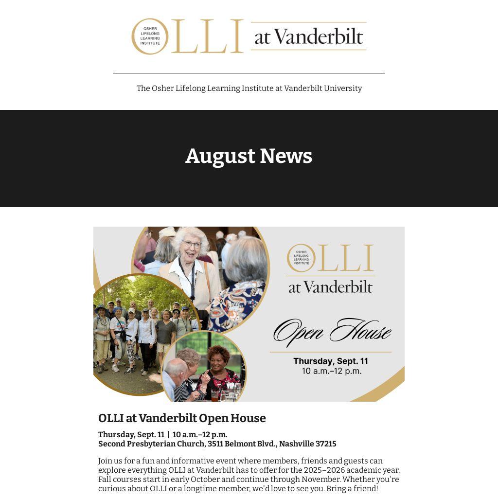 Join us for a fun and informative event where members, friends and guests can explore everything OLLI at Vanderbilt has to offer for the 2025–2026 academic year. Fall courses start in early October and continue through November. Whether you're curious about OLLI or a longtime member, we'd love to see you. Bring a friend!
