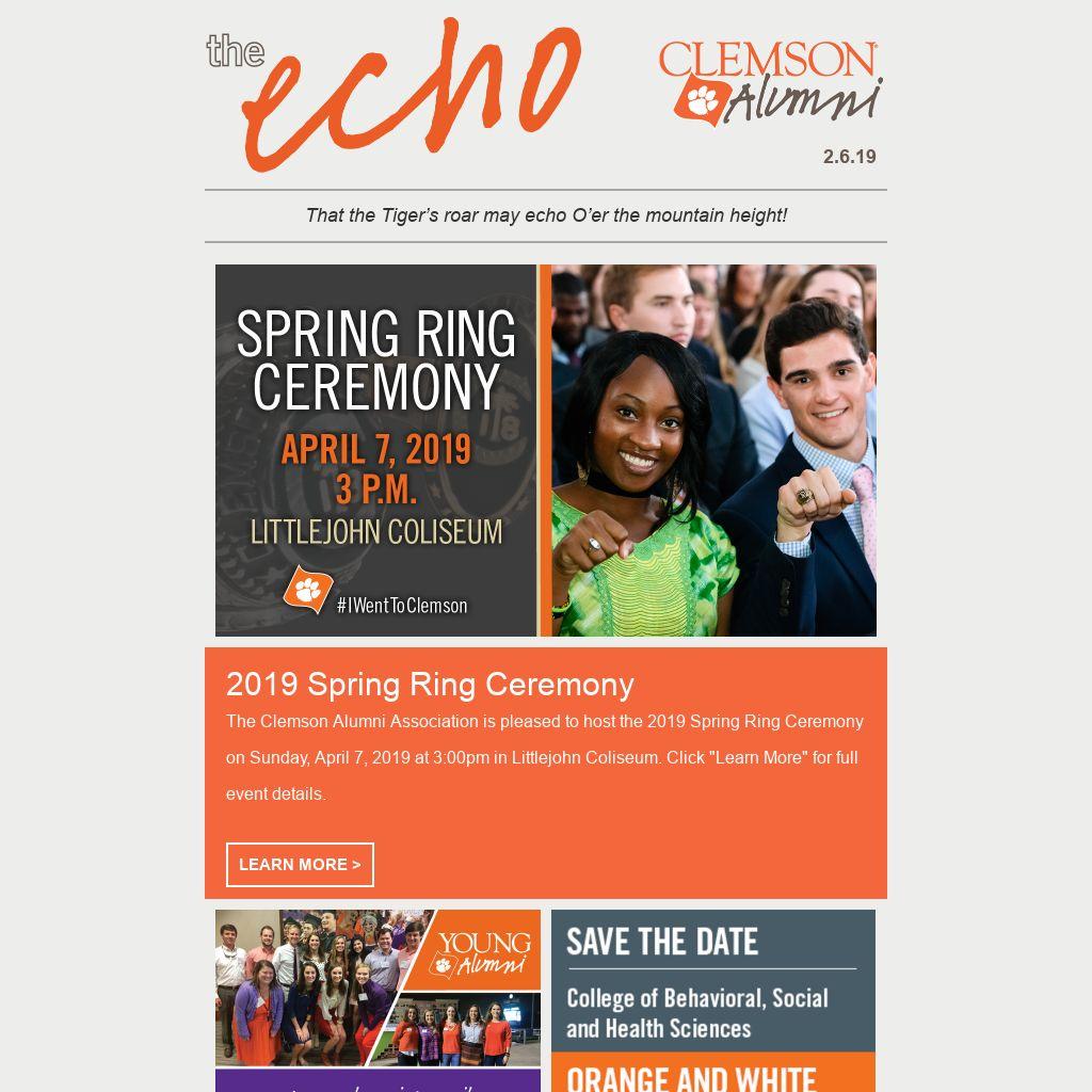 2019 Spring Ring Ceremony The Clemson Alumni Association is pleased to host the 2019 Spring Ring Ceremony on Sunday, April 7, 2019 at 3:00pm in Littlejohn Coliseum. Click "Learn More" for full event details.