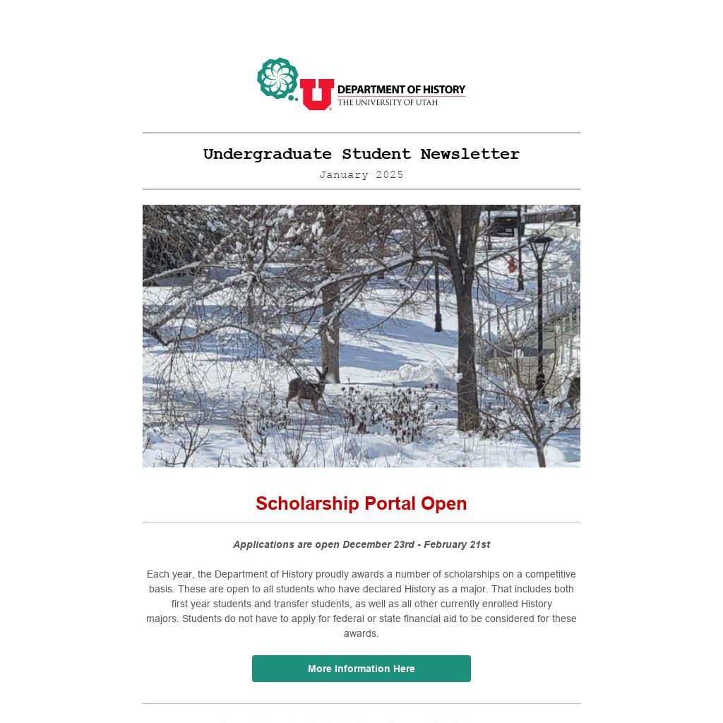 Continuing students who will not register for the Spring semester will need to submit a Leave of Absence by March 17, 2025 or they will be discontinued. Please contact us at: history.utah.edu with questions about this.