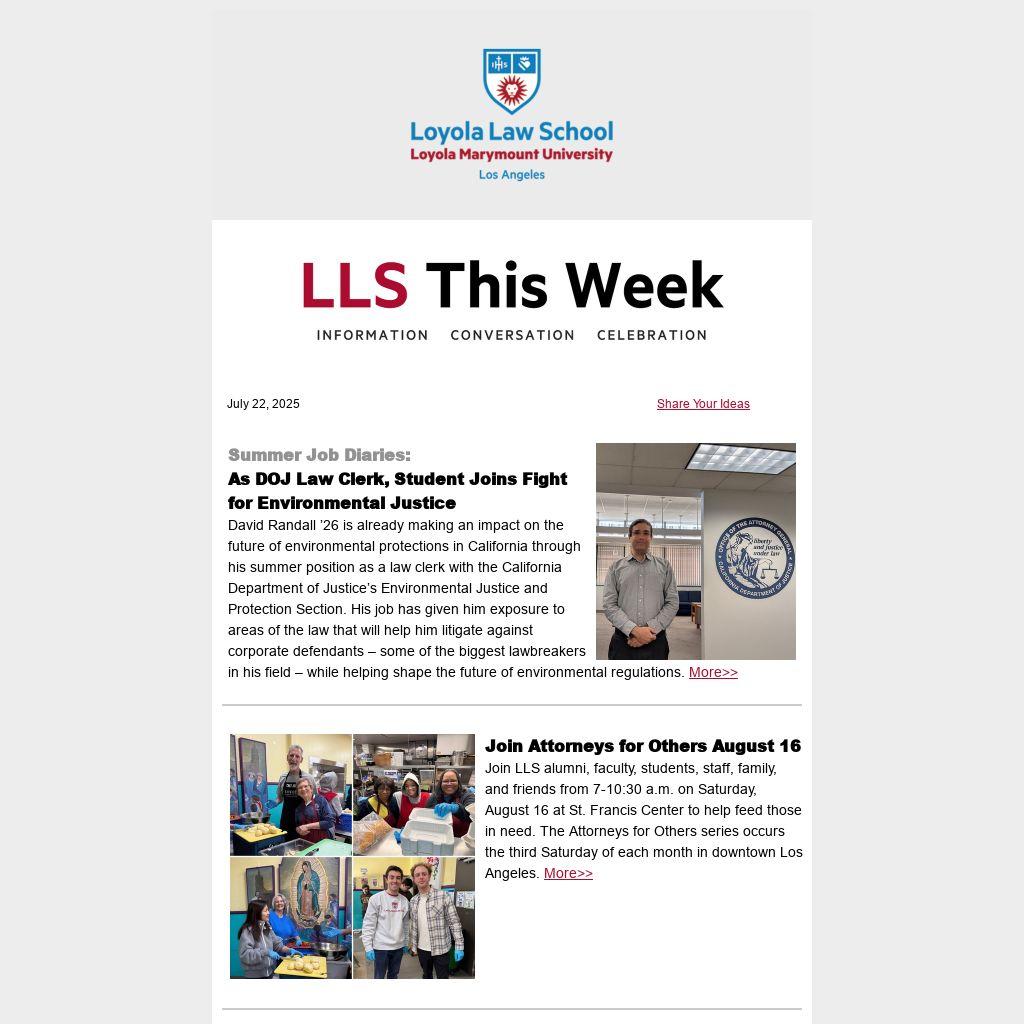 Join LLS alumni, faculty, students, staff, family, and friends from 7-10:30 a.m. on Saturday, August 16 at St. Francis Center to help feed those in need. The Attorneys for Others series occurs the third Saturday of each month in downtown Los Angeles. More>>