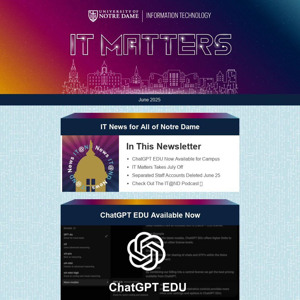 If you’re using ChatGPT for Notre Dame business, switch to ChatGPT EDU starting July 1 for secure, campus-approved AI.