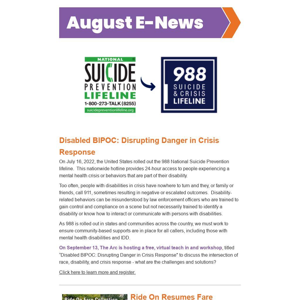 On September 13, The Arc is hosting a free, virtual teach in and workshop, titled “Disabled BIPOC: Disrupting Danger in Crisis Response" to discuss the intersection of race, disability, and crisis response - what are the challenges and solutions?