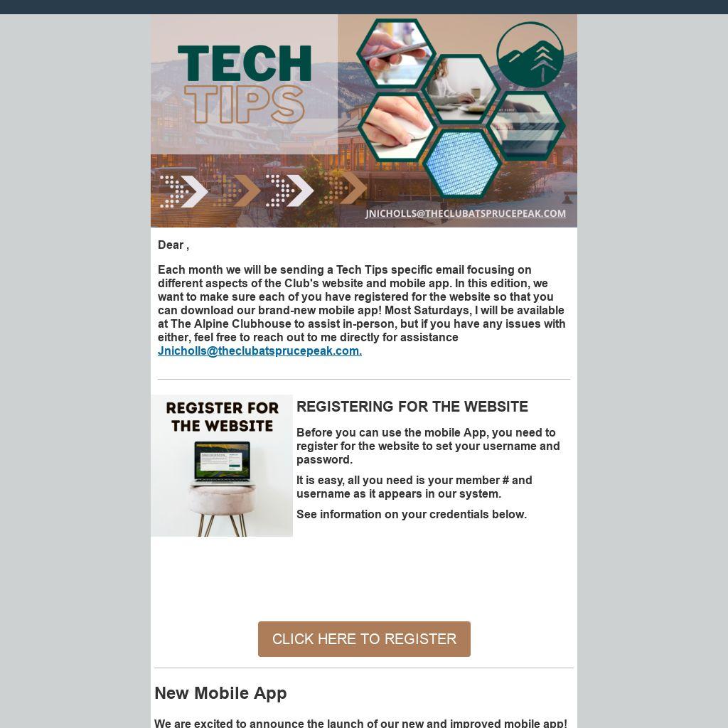 Each month we will be sending a Tech Tips specific email focusing on different aspects of the Club's website and mobile app. In this edition, we want to make sure each of you have registered for the website so that you can download our brand-new mobile app! Most Saturdays, I will be available at The Alpine Clubhouse to assist in-person, but if you have any issues with either, feel free to reach out to me directly for assistance Jnicholls@theclubatsprucepeak.com.