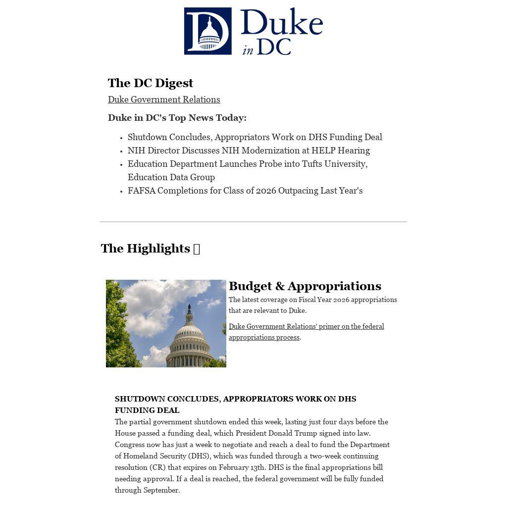 The partial government shutdown ended this week, lasting just four days before the House passed a funding deal, which President Donald Trump signed into law. Congress now has just a week to negotiate and reach a deal to fund the Department of Homeland Security (DHS), which was funded through a two-week continuing resolution (CR) that expires on February 13th. DHS is the final appropriations bill needing approval. If a deal is reached, the federal government will be fully funded through September.