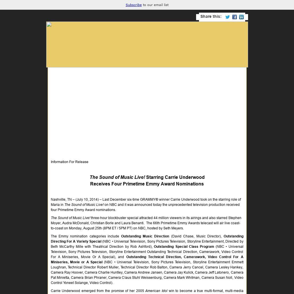 Nashville, TN – (July 10, 2014) – Last December six-time GRAMMY® winner Carrie Underwood took on the starring role of Maria in The Sound of Music Live! on NBC and it was announced today the unprecedented television production received four Primetime Emmy Award nominations.