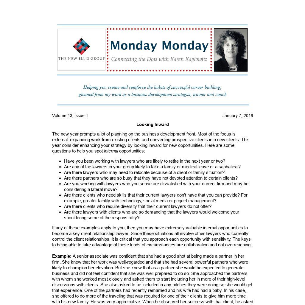The new year prompts a lot of planning on the business development front. Most of the focus is external: expanding work from existing clients and converting prospective clients into new clients. This year consider enhancing your strategy by looking inward for new opportunities. Here are some questions to help you spot internal opportunities: - Have you been working with lawyers who are likely to retire in the next year or two?