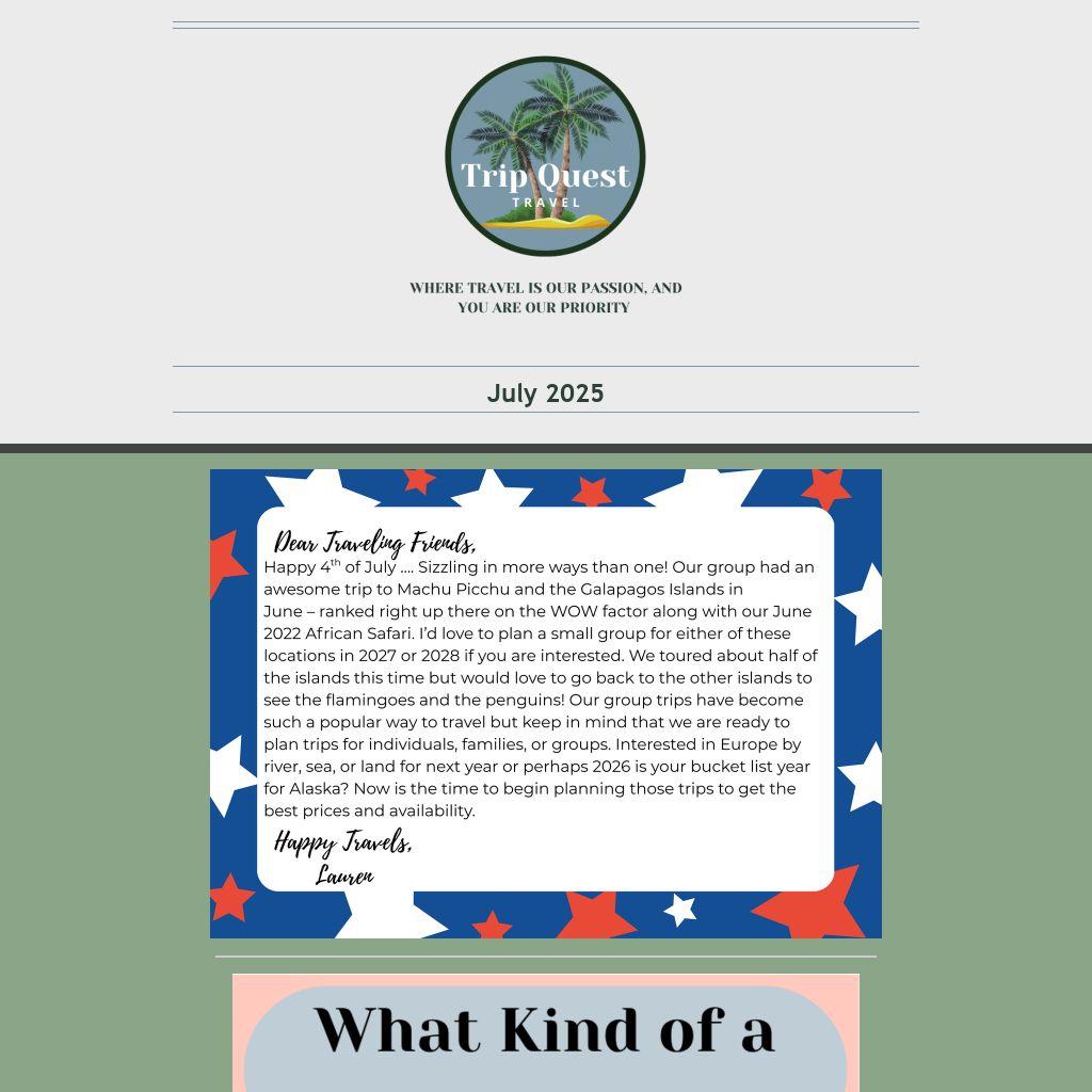 I am Lauren Williams, owner of Trip Quest Travel Services for the past ten years. Moving from three decades in education to becoming a travel consultant has caused me to shift from “The Doctor of Education” to “The Doctor of Travel.” My clients are often just like me – they want a rejuvenating vacation that teaches them about the world and the cultures around them. I love beautiful scenery, exploring new places, and learning something new every day! Aside from travel, I stay busy with my husband, Steve, who has joined me in the travel business, and our four children and thirteen grandchildren. Being active in the church and in our community feeds our souls as well. I love to play pickleball and bridge when I am not helping clients plan that perfect trip! Because our world is so much smaller now, I am happy to work with clients wherever they might live…but by referral only. Let me know if you have friends or family who would like to be added to my monthly newsletter list! Also, let me know if there is something you’d like to know more about!