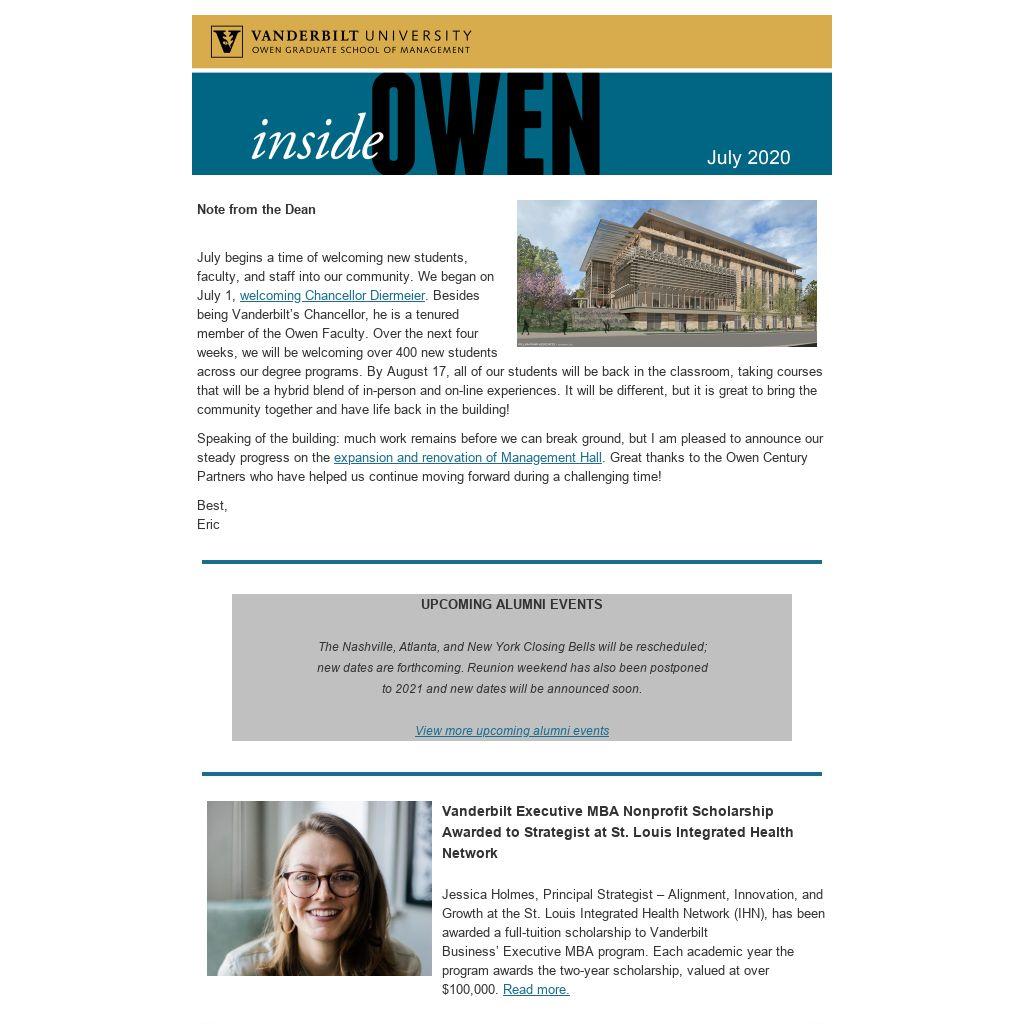 Speaking of the building: much work remains before we can break ground, but I am pleased to announce our steady progress on the expansion and renovation of Management Hall. Great thanks to the Owen Century Partners who have helped us continue moving forward during a challenging time!