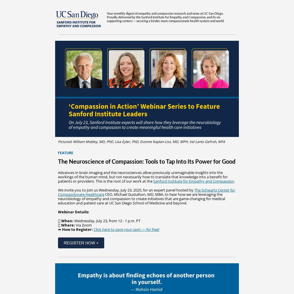 We invite you to join us Wednesday, July 23, 2025, for an expert panel hosted by The Schwartz Center for Compassionate Healthcare CEO, Michael Gustafson, MD, MBA, to hear how we are leveraging the neurobiology of empathy and compassion to create initiatives that are game-changing for medical education and patient care at UC San Diego School of Medicine and beyond.Â
