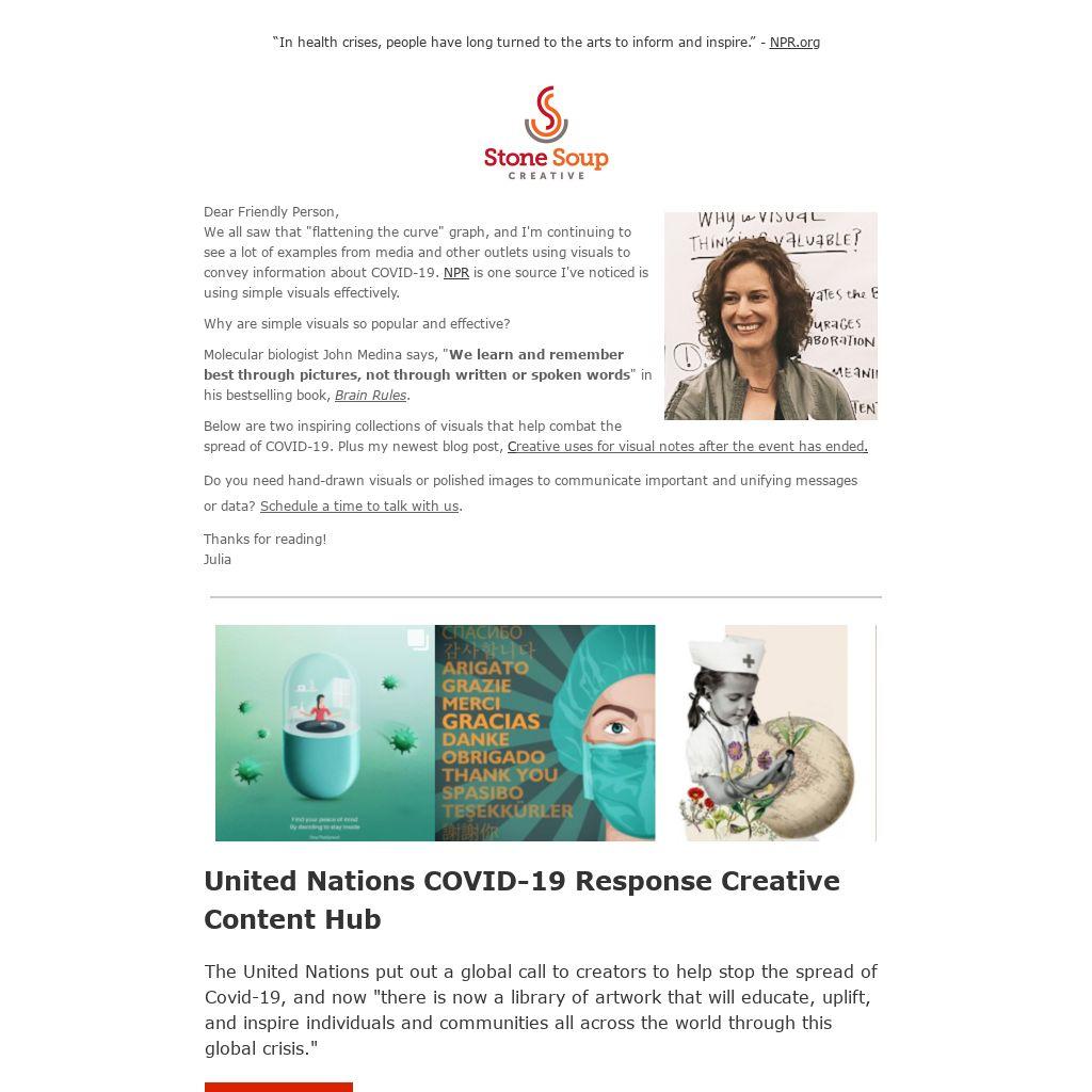Dear Friendly Person, We all saw that "flattening the curve" graph, and I'm continuing to see a lot of examples from media and other outlets using visuals to convey information about COVID-19. NPR is one source I've noticed is using simple visuals effectively.