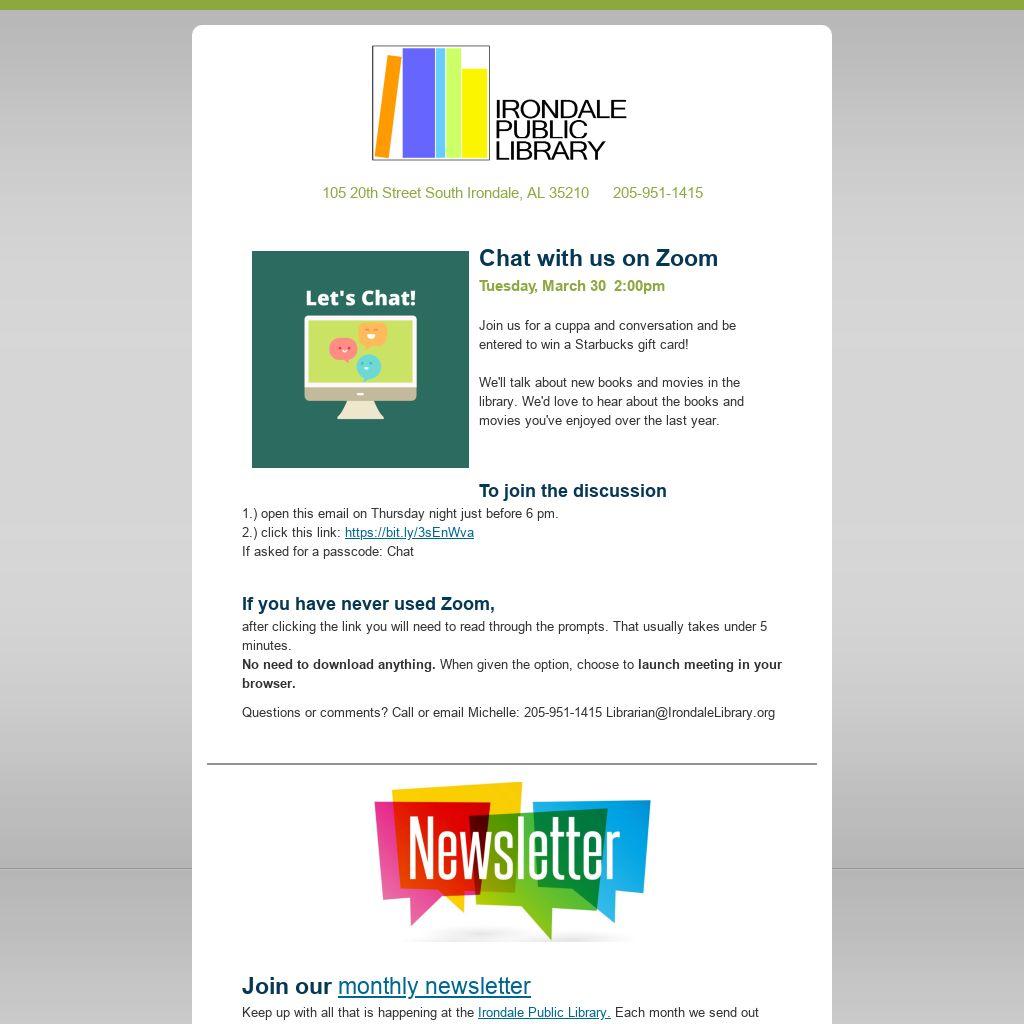 Questions or comments? Call or email Michelle: 205-951-1415 Librarian@IrondaleLibrary.org