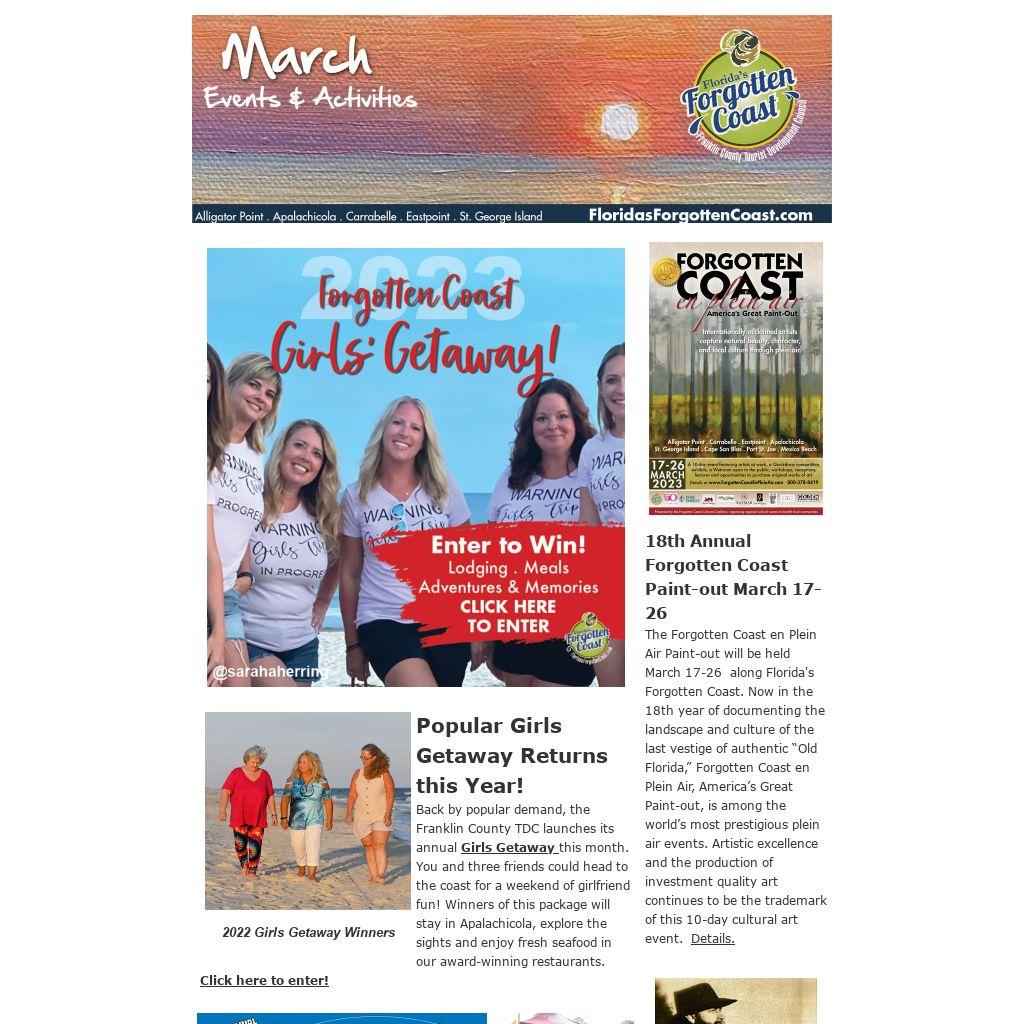 Popular Girls Getaway Returns this Year! Back by popular demand, the Franklin County TDC launches its annual Girls Getaway this month. You and three friends could head to the coast for a weekend of girlfriend fun! Winners of this package will stay in Apalachicola, explore the sights and enjoy fresh seafood in our award-winning restaurants. Click here to enter!