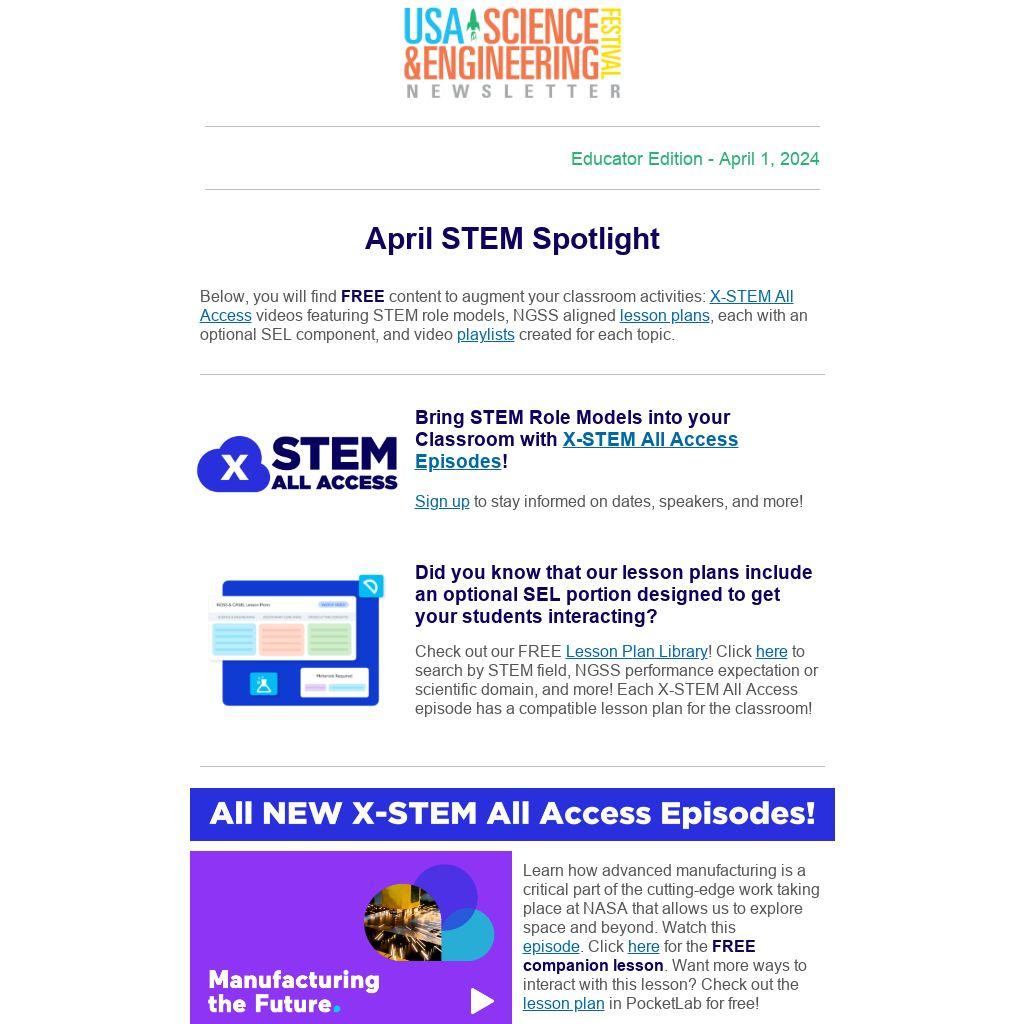 Check out our FREE Lesson Plan Library! Click here to search by STEM field, NGSS performance expectation or scientific domain, and more! Each X-STEM All Access episode has a compatible lesson plan for the classroom!