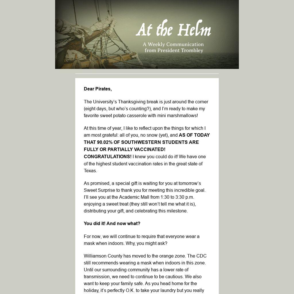 At this time of year, I like to reflect upon the things for which I am most grateful: all of you, no snow (yet), and AS OF TODAY THAT 90.02% OF SOUTHWESTERN STUDENTS ARE FULLY OR PARTIALLY VACCINATED! CONGRATULATIONS! I knew you could do it! We have one of the highest student vaccination rates in the great state of Texas.