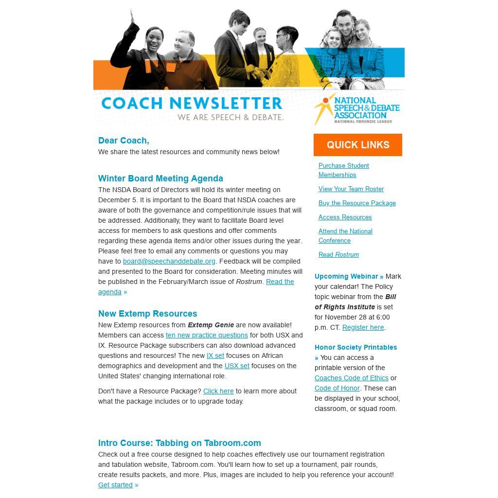 The NSDA Board of Directors will hold its winter meeting on December 5. It is important to the Board that NSDA coaches are aware of both the governance and competition/rule issues that will be addressed. Additionally, they want to facilitate Board level access for members to ask questions and offer comments regarding these agenda items and/or other issues during the year. Please feel free to email any comments or questions you may have to board@speechanddebate.org. Feedback will be compiled and presented to the Board for consideration. Meeting minutes will be published in the February/March issue of Rostrum. Read the agenda»