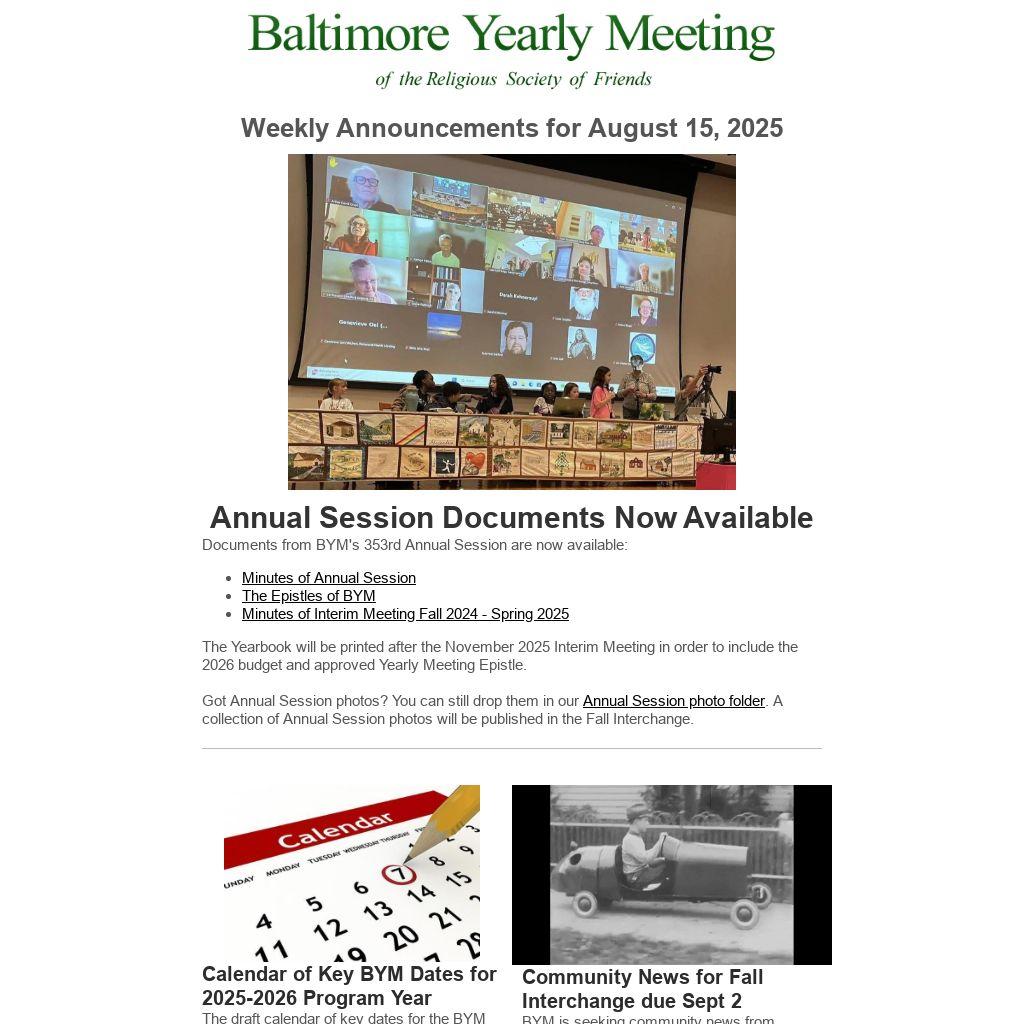 The BYM Office will be closed and all staff on vacation for our annual Sabbath Week, August 18-22. After a busy summer season of many long days and weekends to run BYM Camps and Annual Session, our staff take a collective week of rest. During the Sabbath Week, staff will not be reading /responding to emails or phone calls, and there will be no Weekly Announcements on Fri, Aug 22nd. Staff will return to their desks on Mon, Aug 25th.