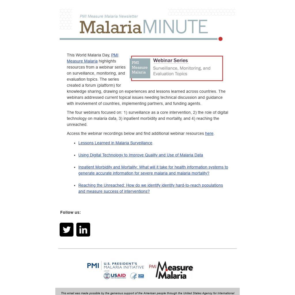 This World Malaria Day, PMI Measure Malaria highlights resources from a webinar series on surveillance, monitoring, and evaluation topics. The series created a forum (platform) for knowledge sharing, drawing on experiences and lessons learned across countries. The webinars addressed current topical issues needing technical discussion and guidance with involvement of countries, implementing partners, and funding agents.