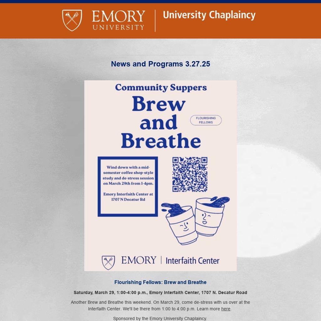 Emory University Chaplaincy ENews is published weekly during term publicizing Atlanta-campus spiritual life programs. It is not a comprehensive listing. For Oxford College spiritual life, please click here. To submit information or to update your preferences, please contact religiouslife@emory.edu.