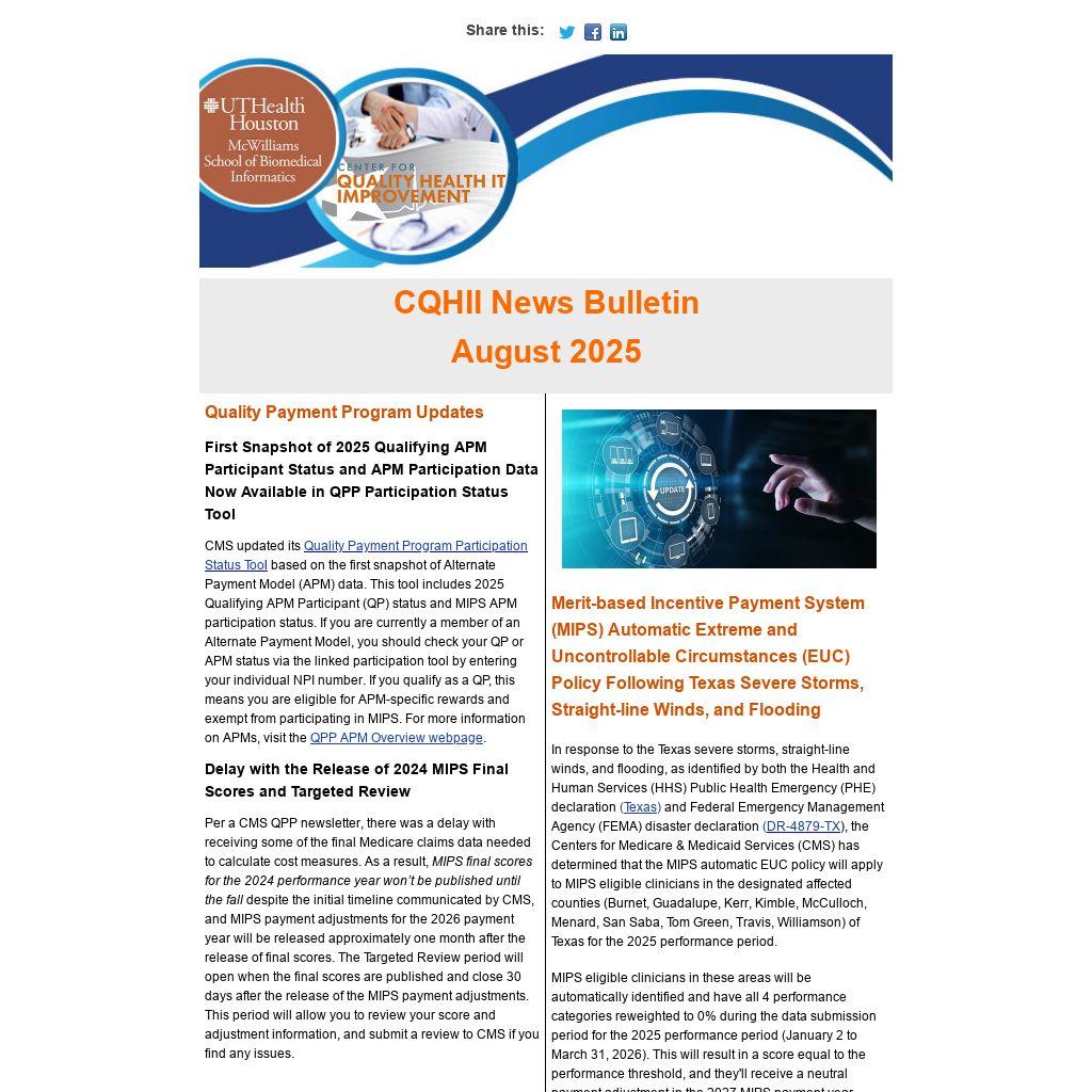 In response to the Texas severe storms, straight-line winds, and flooding, as identified by both the Health and Human Services (HHS) Public Health Emergency (PHE) declaration (Texas) and Federal Emergency Management Agency (FEMA) disaster declaration (DR-4879-TX), the Centers for Medicare & Medicaid Services (CMS) has determined that the MIPS automatic EUC policy will apply to MIPS eligible clinicians in the designated affected counties (Burnet, Guadalupe, Kerr, Kimble, McCulloch, Menard, San Saba, Tom Green, Travis, Williamson) of Texas for the 2025 performance period.