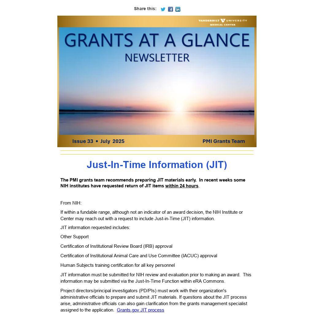 The PMI grants team recommends preparing JIT materials early. In recent weeks some NIH institutes have requested return of JIT items within 24 hours.