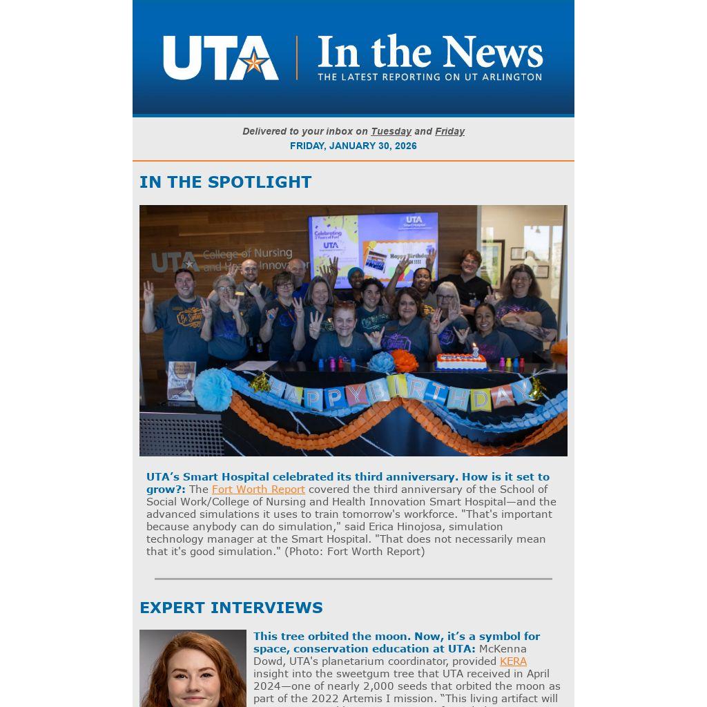 This tree orbited the moon. Now, it’s a symbol for space, conservation education at UTA: McKenna Dowd, UTA's planetarium coordinator, provided KERA insight into the sweetgum tree that UTA received in April 2024—one of nearly 2,000 seeds that orbited the moon as part of the 2022 Artemis I mission. “This living artifact will serve as a tangible representation of our dedication as a campus to scientific advancement, environmental stewardship, and global collaboration,” Dowd said. The Fort Worth Report also covered this story.