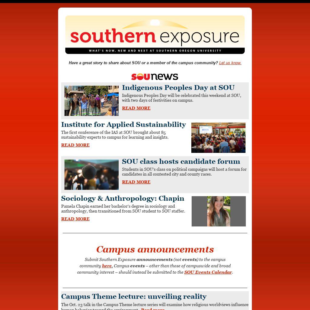 Submit Southern Exposure announcements (not events) to the campus community here. Campus events – other than those of campuswide and broad community interest – should instead be submitted to the SOU Events Calendar.