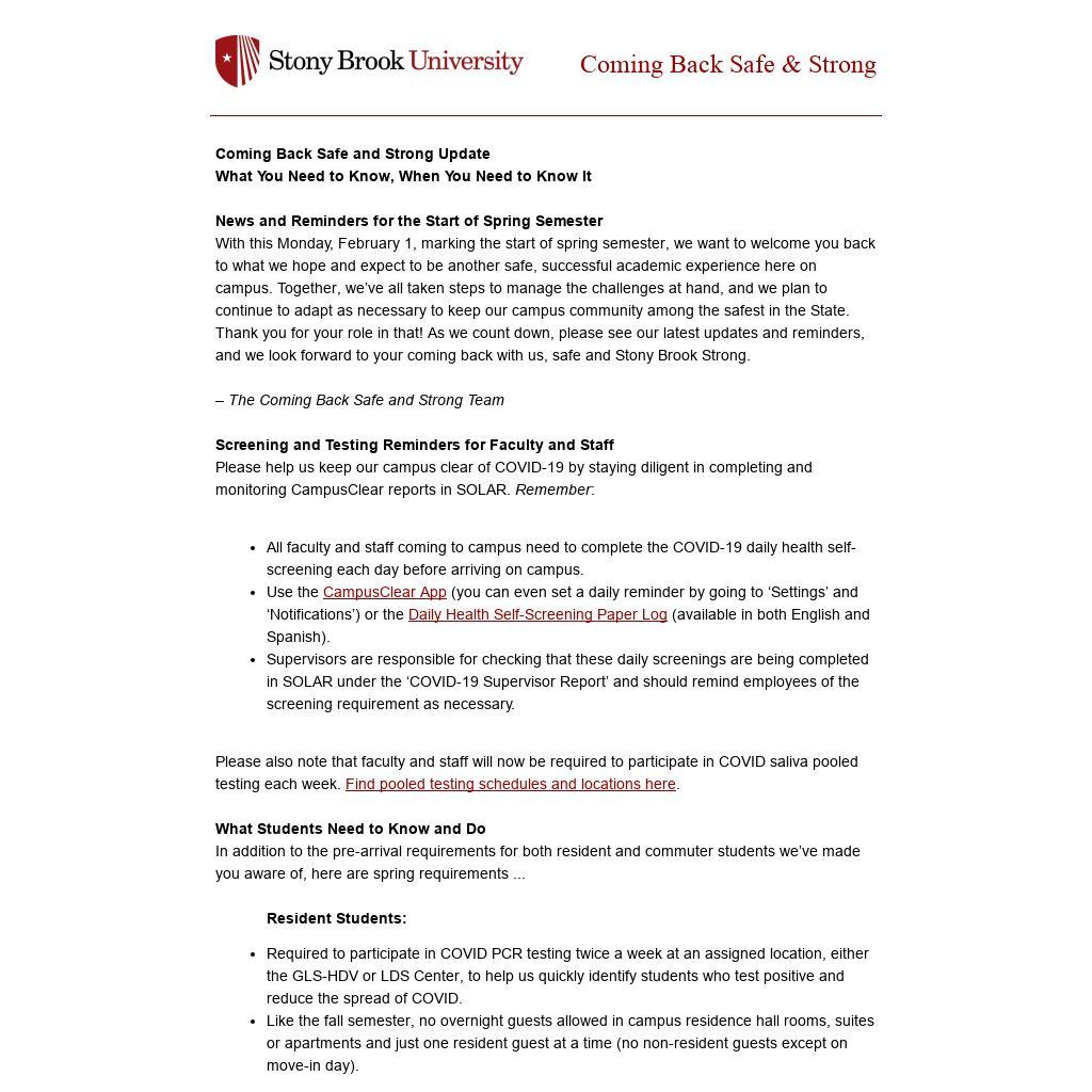 With this Monday, February 1, marking the start of spring semester, we want to welcome you back to what we hope and expect to be another safe, successful academic experience here on campus. Together, we’ve all taken steps to manage the challenges at hand, and we plan to continue to adapt as necessary to keep our campus community among the safest in the State. Thank you for your role in that! As we count down, please see our latest updates and reminders, and we look forward to your coming back with us, safe and Stony Brook Strong.