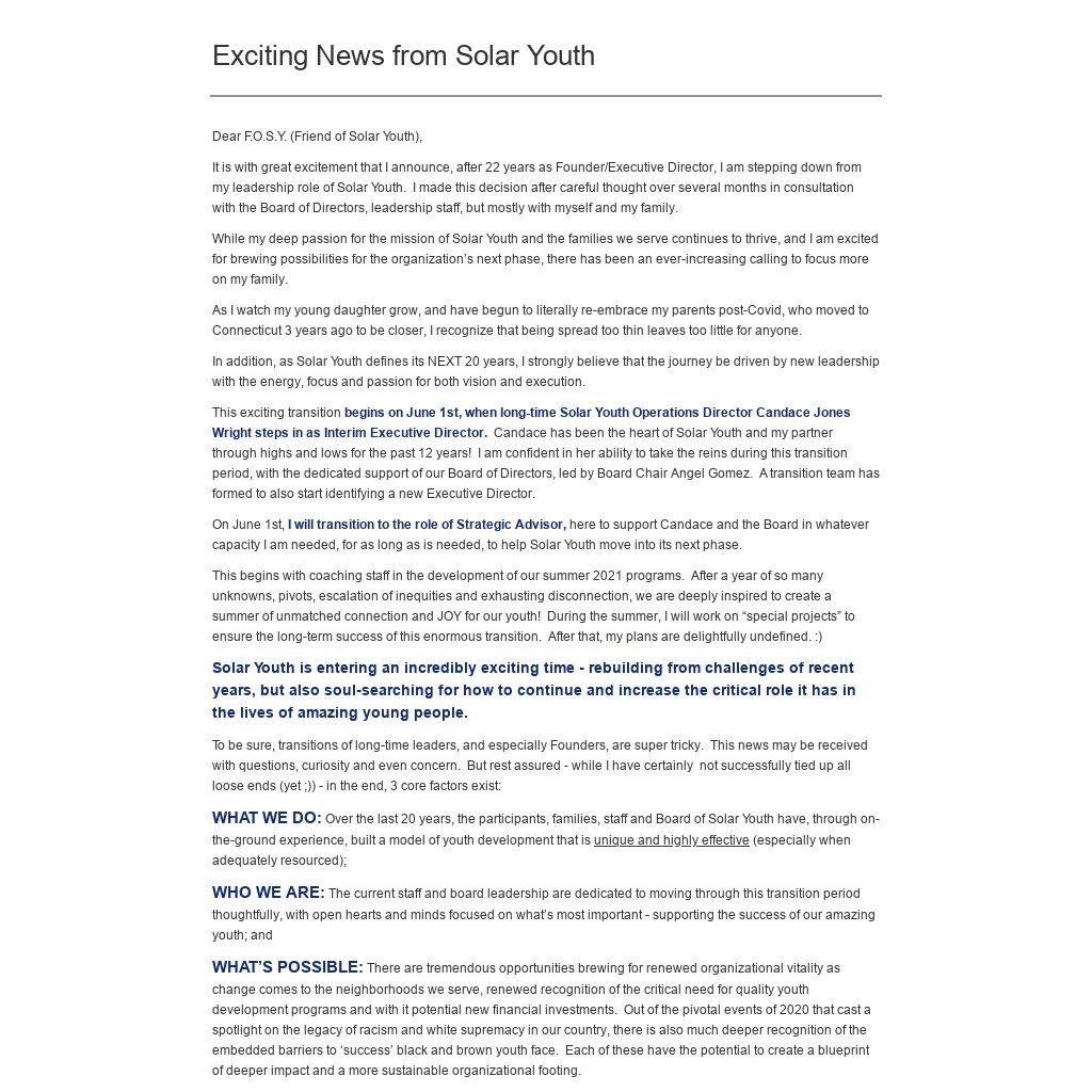 On June 1st, I will transition to the role of Strategic Advisor, here to support Candace and the Board in whatever capacity I am needed, for as long as is needed, to help Solar Youth move into its next phase.