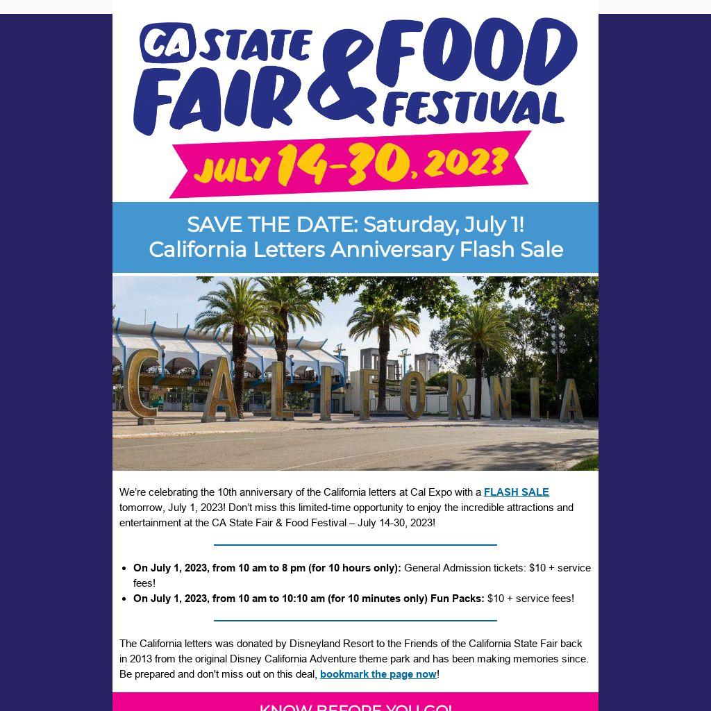 We’re celebrating the 10th anniversary of the California letters at Cal Expo with a FLASH SALE tomorrow, July 1, 2023! Don’t miss this limited-time opportunity to enjoy the incredible attractions and entertainment at the CA State Fair & Food Festival – July 14-30, 2023!