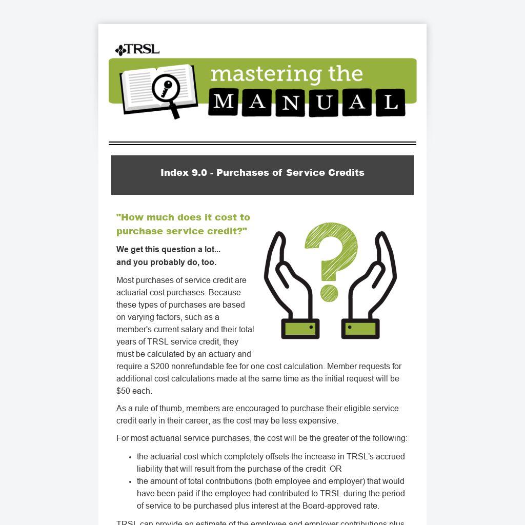 Most purchases of service credit are actuarial cost purchases. Because these types of purchases are based on varying factors, such as a member's current salary and their total years of TRSL service credit, they must be calculated by an actuary and require a $200 nonrefundable fee for one cost calculation. Member requests for additional cost calculations made at the same time as the initial request will be $50 each.