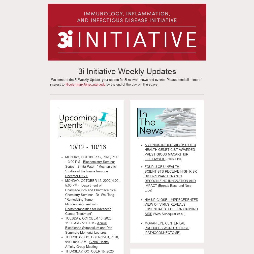 Welcome to the 3i Weekly Update, your source for 3i relevant news and events. Please send all items of interest to Nicole.Frank@hsc.utah.edu by the end of the day on Thursdays.