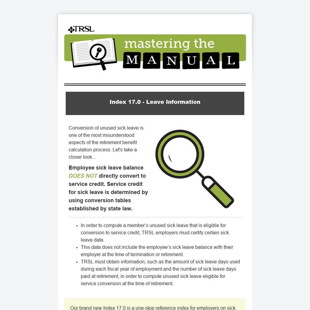 - In order to compute a member’s unused sick leave that is eligible for conversion to service credit, TRSL employers must certify certain sick leave data.