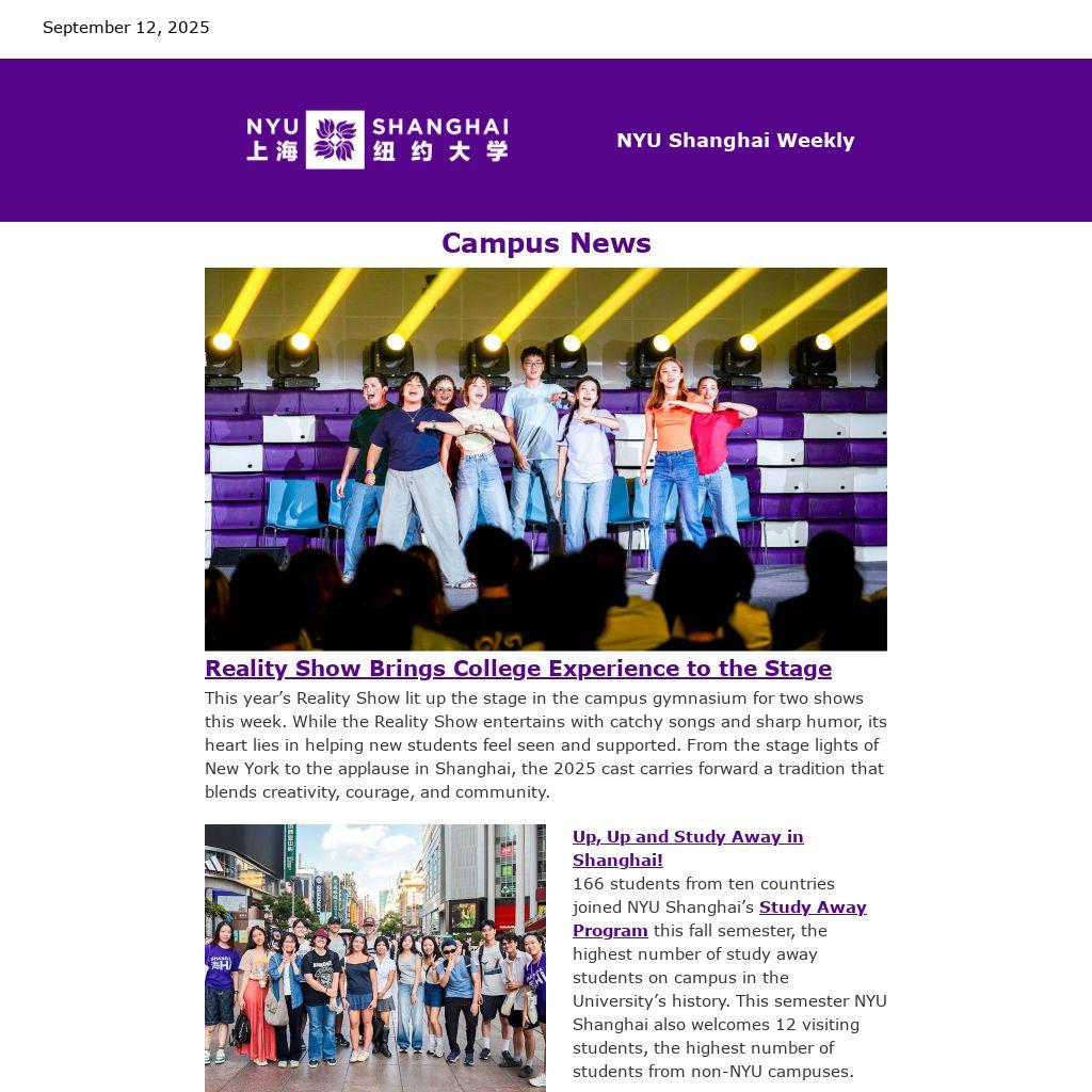 This year’s Reality Show lit up the stage in the campus gymnasium for two shows this week. While the Reality Show entertains with catchy songs and sharp humor, its heart lies in helping new students feel seen and supported. From the stage lights of New York to the applause in Shanghai, the 2025 cast carries forward a tradition that blends creativity, courage, and community.
