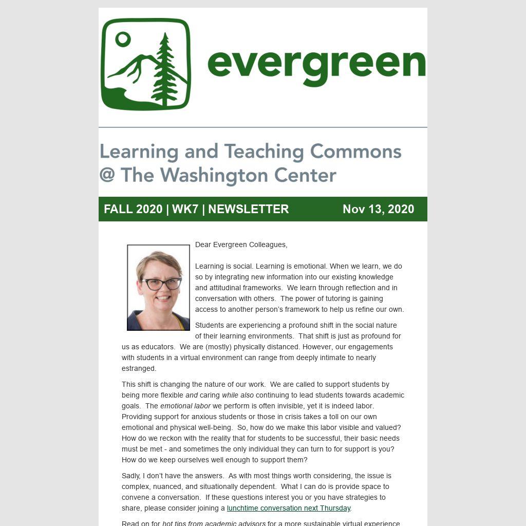 Do what you can to encourage students to gather in dyad, triad, and other small group arrangements outside of synchronous class time so that they can build the social benefits of school while learning online at Evergreen.