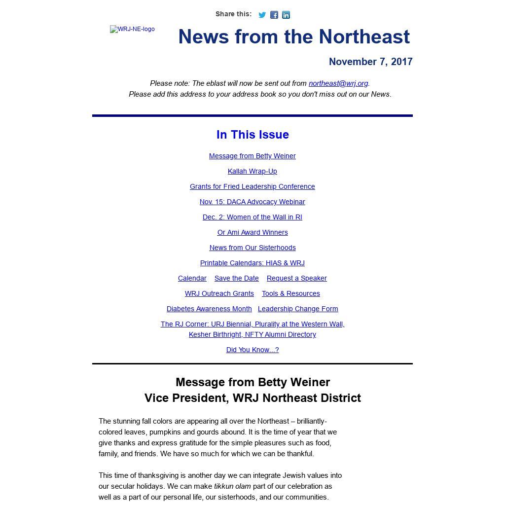 Please note: The eblast will now be sent out from northeast@wrj.org.