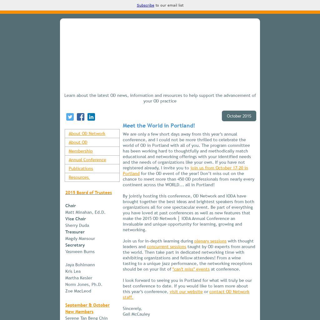 | Last Chance to Register for the Annual Conference Don’t miss the opportunity to attend the 2015 OD Network │ IODA Annual Conference. Register today to join the WORLD of OD from October 17-20 in Portland, Oregon. Browse the full 2015 annual conference schedule for a glimpse at what you can expect – starting with a Friday Field Trip and pre-conference session on Saturday.