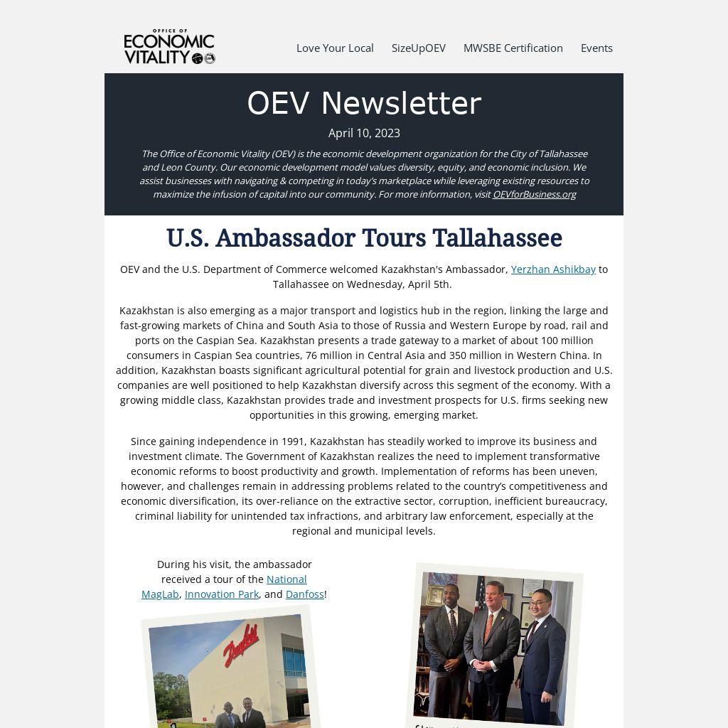 OEV and the U.S. Department of Commerce welcomed Kazakhstan's Ambassador, Yerzhan Ashikbay to Tallahassee on Wednesday, April 5th.