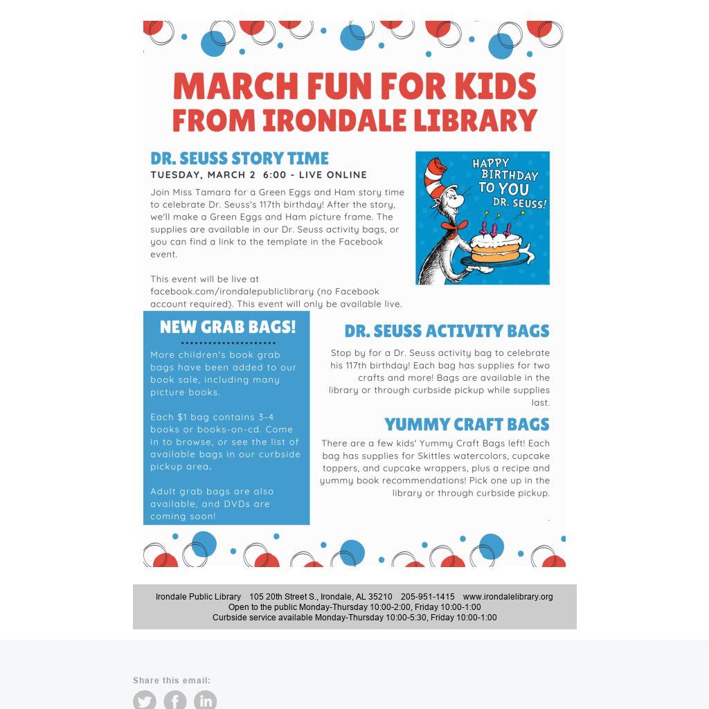 Two Activity Bags, a Dr. Seuss Story Time, and New Book Sale Bags!
